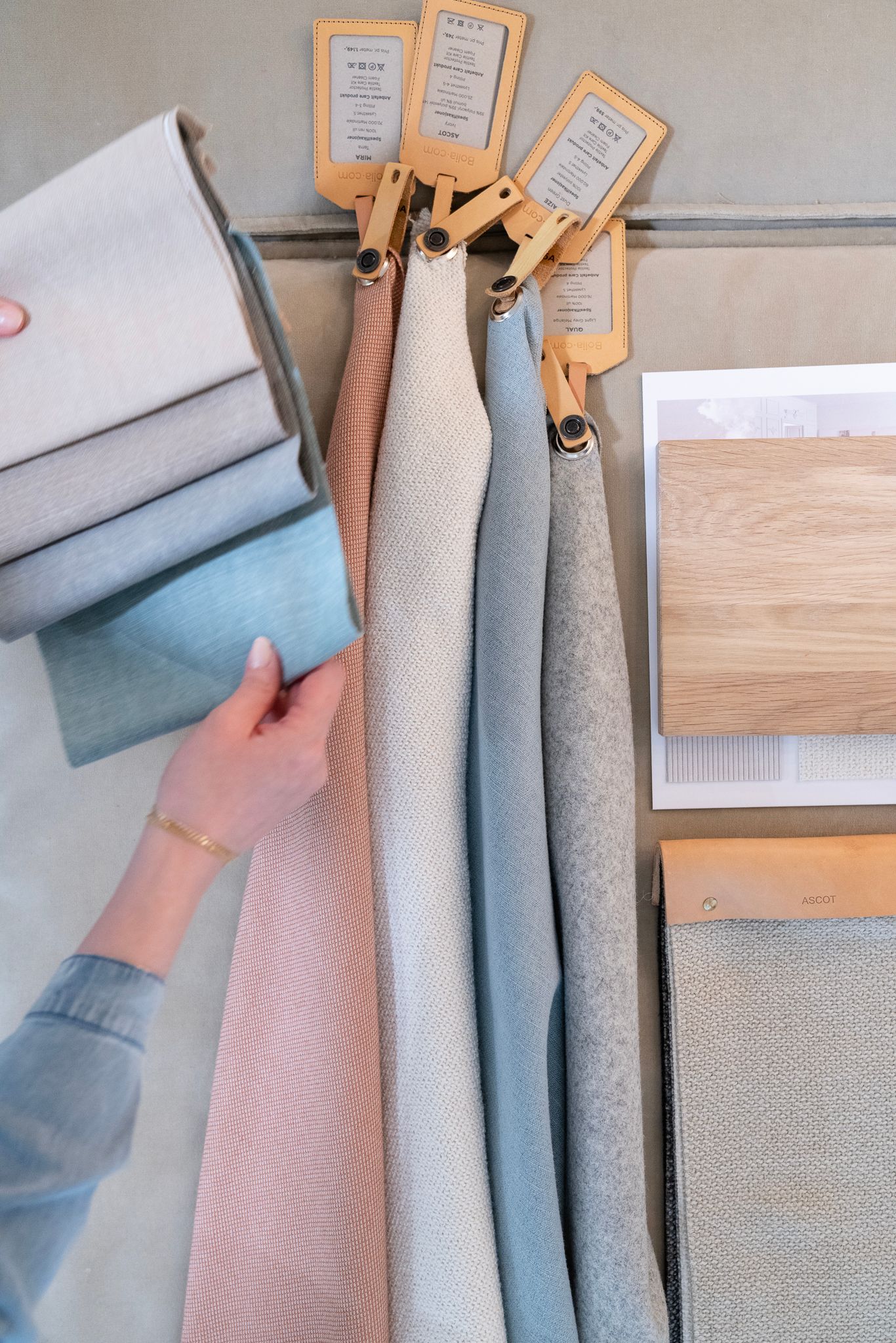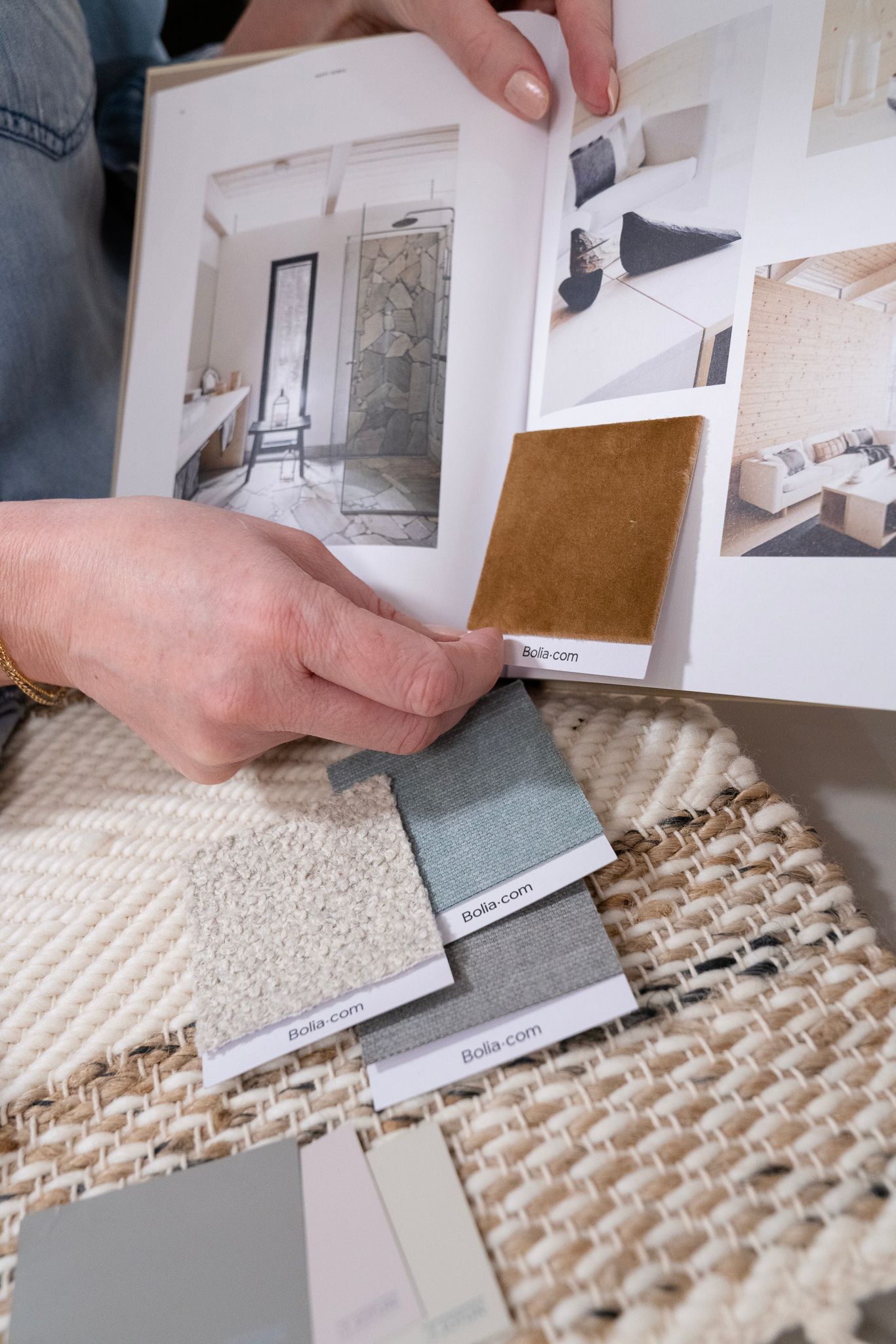 Lag deg en kollage med alle farger og materialer du ønsker deg, se om det passer sammen og be om faglig synspunkter før du bestemmer deg. La en slik palett ligge fremme en stund før du tar ett endelig valg. Lammeull er i tiden som her på en nydelig lenestol fra Bolia.